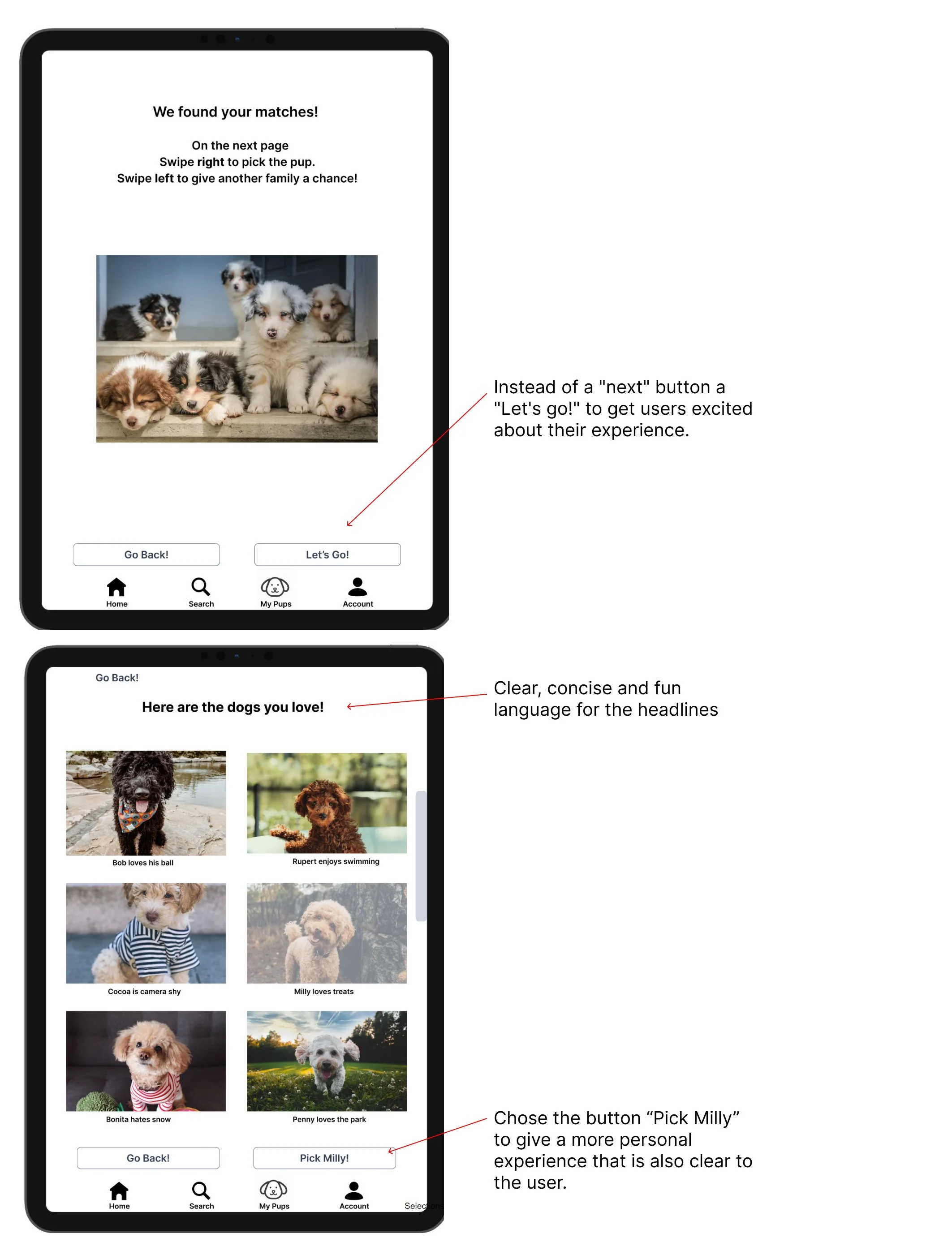 I added a "meet pup" button and personalized it so the selected pup's name would appear on the button. This worked great because users had already learned to click the button to continue in the process.